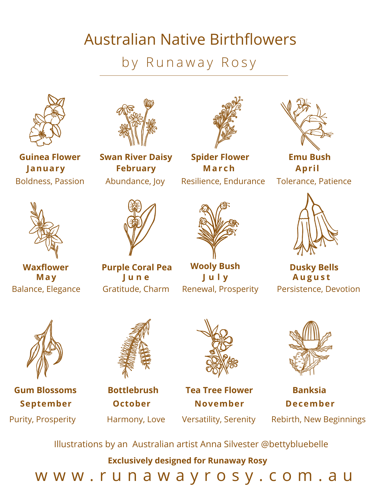 Australian Native Birth Flowers Collection is intricately hand drawn by an Australian artist @bettybluebelle and exclusively designed for Runaway Rosy.