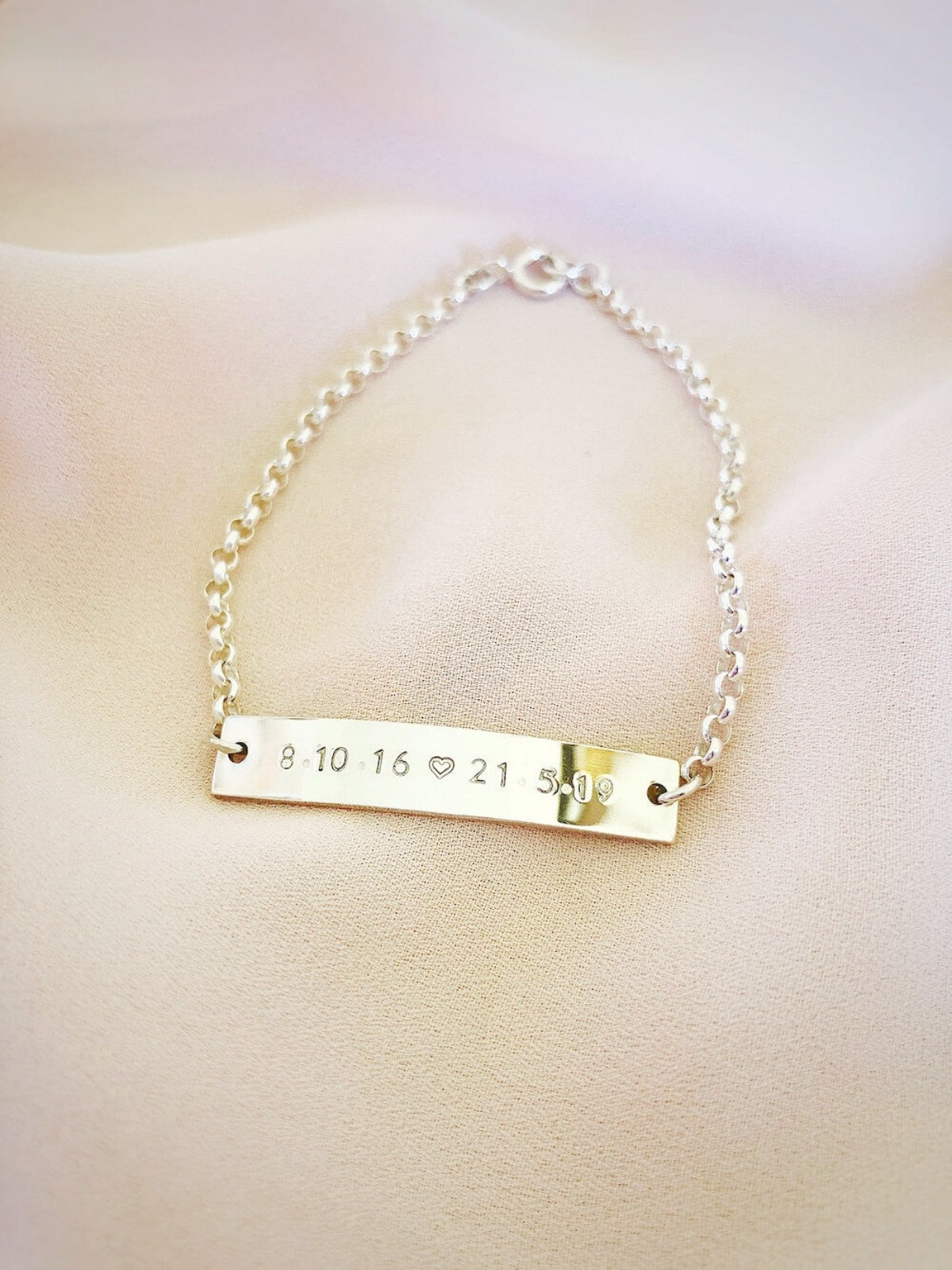 Brooklyn Bar Bracelet is our standard sized bar (38 mm) made into a bracelet. There is plenty of room for personalisation. It can be stamped with up to 16 characters (including space and design) with our Tiny Simple Font (other fonts available in the options below). It's perfect to personalised with names, initials, special dates, coordinates, and a short phrase.