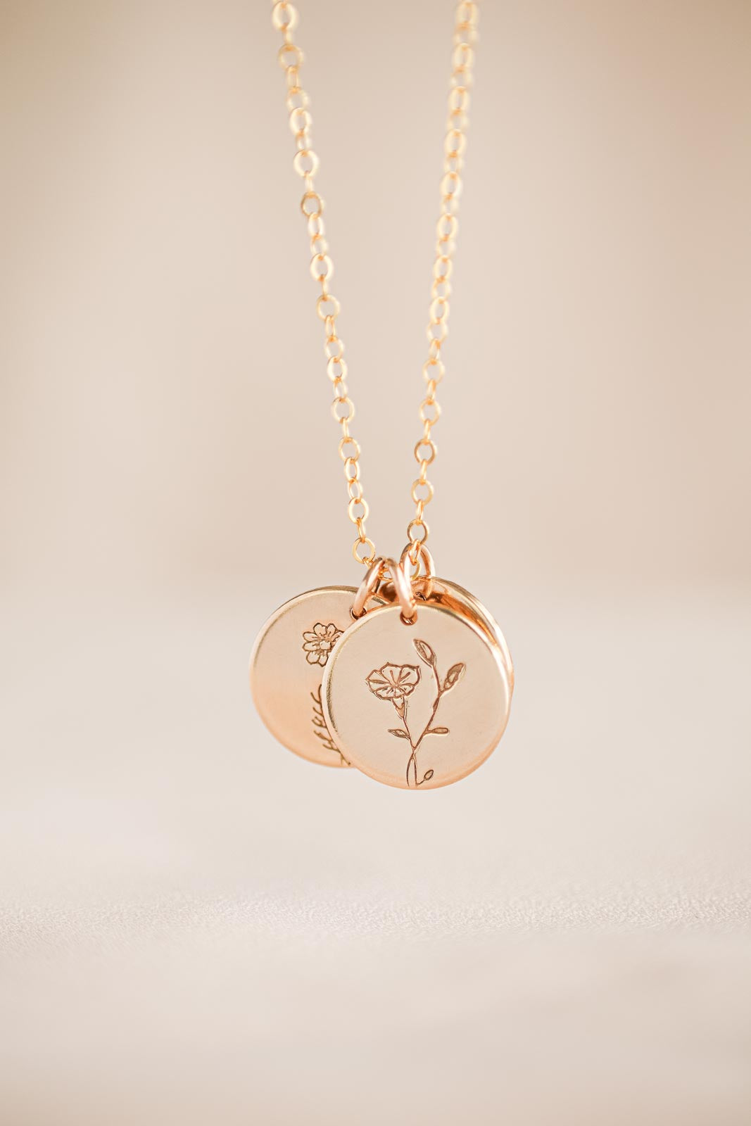 Made with recycled Australian Sterling Silver, 14k Gold Filled and 14k Rose Gold Filled. Birthflowers are delicately handstamped on 14mm pendants.