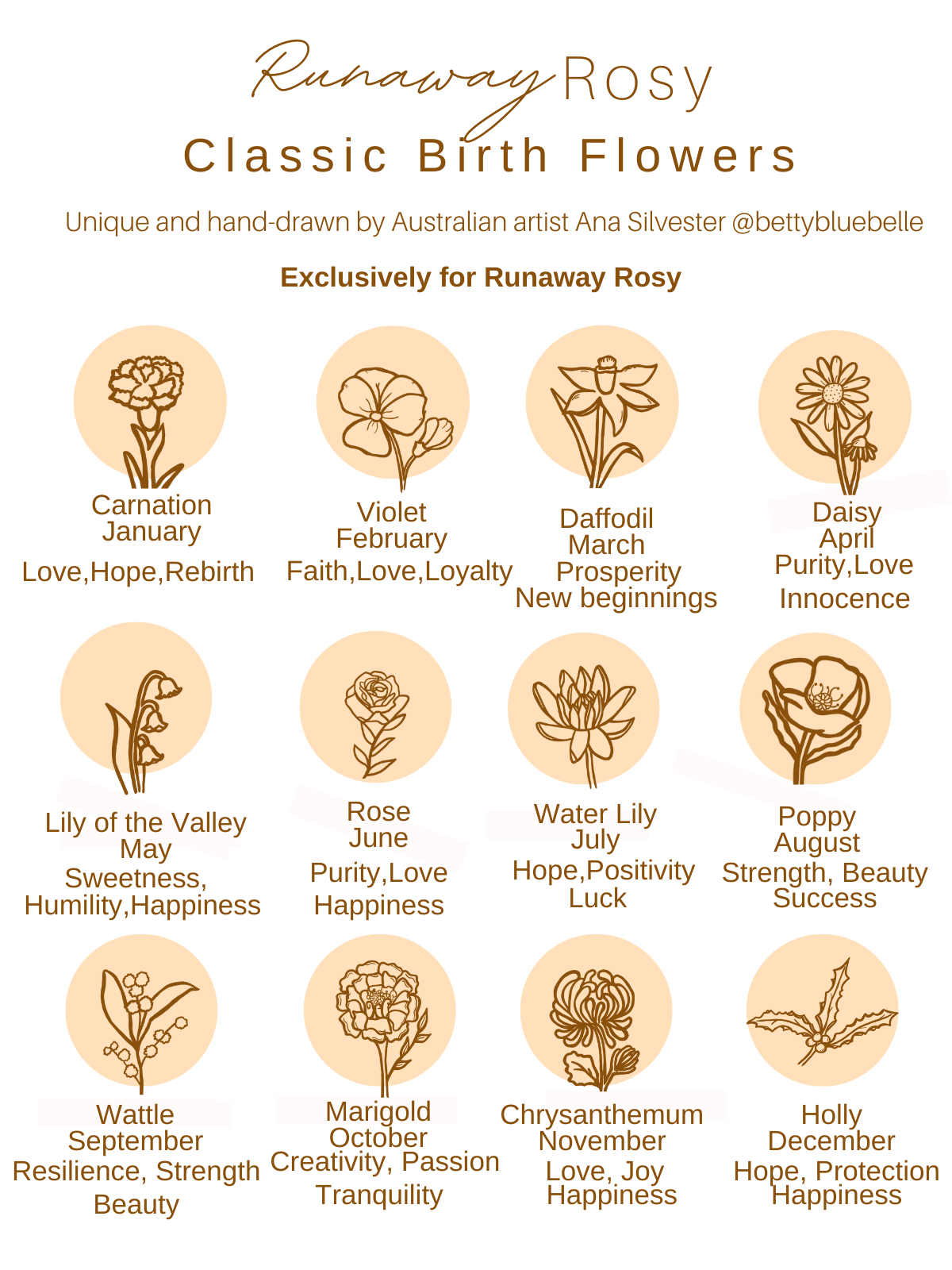 Our Birth Flowers Collection is hand-drawn by an Australian artist and they are unique only to Runaway Rosy.